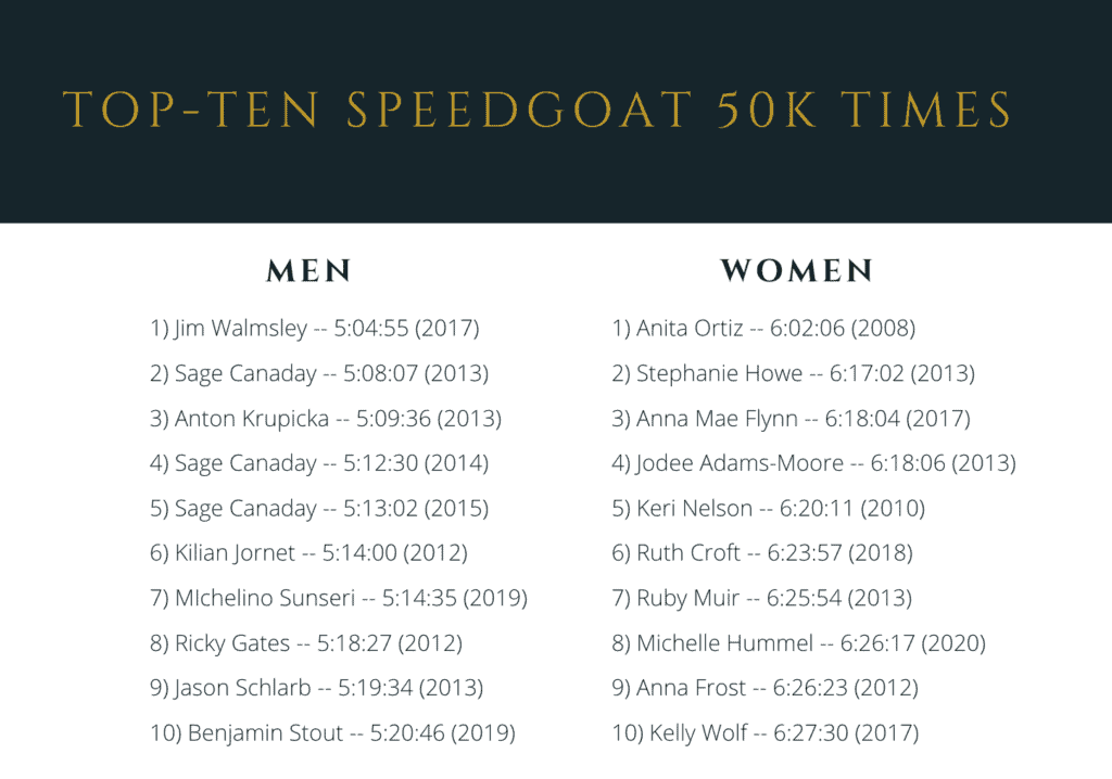 When you look at a lot of the top times, the race definitely feels like a throw-back to another era. And of course I can’t go on without focusing your gaze on that Tony Krupicka time from 2013. The course has changed a bit over the years but I found Sage’s 2013 Strava data from the same year and that course is definitely on par with what we’ll see this weekend. So yeah, Anton threw down, ran that sucker faster than Kilian. Okay, that’s enough. On the women’s side, Anita Ortiz, wow, there’s an outlier performance. I don’t see that time ever getting beat! Of course it will someday but she must have ran out of her mind that day. The #2 all-time result from Steph Howe is also worth noting. I forget how versatile she is. She can win races like Western States and Lake Sonoma but then also throw down on a real vertfest like Speedgoat. I’m predicting someone will crack the top-ten on both the men’s and women’s side this weekend, but how deep into the top ten? Who knows. It’s going to be exciting!